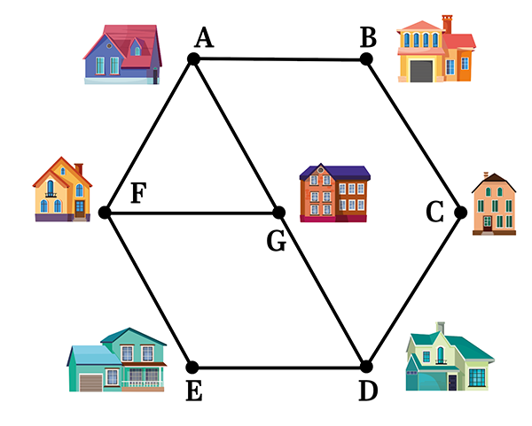 Au village de Coulra-Houle, on prend son temps : pour aller d’une maison à une autre (en suivant bien sûr l’une des neuf routes tracées), on ne choisit jamais le chemin le plus court mais toujours le plus long possible. Toutefois, il est interdit de passer deux fois au même endroit, sinon personne n’arriverait à destination ! Par exemple, pour aller de B à C, on ne fait pas le trajet B-C mais B-A-G-F-E-D-C, soit 600 m, car il y a toujours 100 m entre deux maisons consécutives.