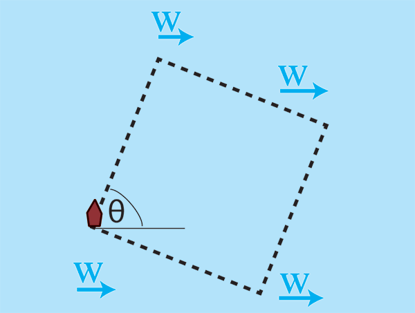 Dans un estuaire où l’on a un courant constant et uniforme de vitesse w, un bateau de pêche se déplace à une vitesse constante v par rapport à la rivière, sachant que v > w. Le bateau s’oriente constamment en fonction du courant de façon à décrire un carré de côté 1 hm orienté d’un angle θ ≤ π/2 par rapport au courant.