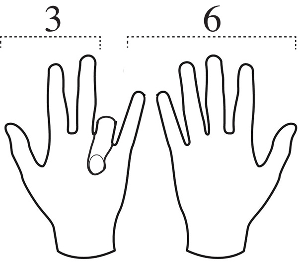 Pour connaître le résultat de la multiplication de 9 par 4, Manuel lève les dix doigts et plie le quatrième doigt à partir de la gauche.