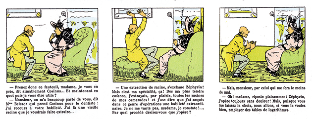 Le héros de Christophe se réveille un jour avec une douleur lancinante dans la moitié droite de la mâchoire inférieure et prend rendez-vous chez le dentiste Max Hilaire. Dans le salon d'attente, Cosinus rencontre Madame Belazor, qui doit se faire extraire une racine, et notre mathématicien, oubliant qu'il est chez le dentiste, se croit chez lui et se propose de soigner la dame en extrayant la racine avec des tables de logarithmes. L'affaire se terminera mal pour le dentiste : Madame Belazor s'étant enfuie et ayant déclaré que Max Hilaire était fou, la police vient arrêter ce dernier pour l'enfermer dans un asile. Notre pauvre dentiste, camisolé de force, devient effectivement dément et se ... Lire la suite
