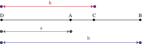 La version « soft » de ce fameux birapport est la division harmonique. On retrouve dans cet adjectif le mot grec « armonia » et sa connotation musicale chez Pythagore. En effet, si une corde fixée à ses deux extrémités D et B (D donnant le do) est pincée en son milieu A, on obtient par vibration le do une octave au-dessus. Si maintenant on la pince en C, au tiers de [AB], on obtient le sol : c’est cela, armonia. On dira à la Renaissance que DC est moyenne harmonique entre DB et DA, ce que l’on traduit par l’égalité ou encore, avec les notations de la figure,