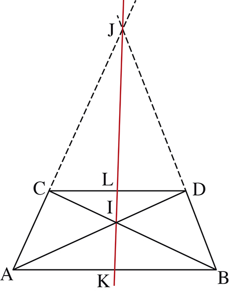 Que se passe-t-il en effet si le point C est milieu de [AB] ? On ne peut plus alors trouver de point D « visible » tel que la relation précédente soit vérifiée : on dit alors que D est le point à l’infini de la droite (AB). Ce passage à la limite prend consistance dans le petit problème suivant. Dans un trapèze ABCD, où les côtés parallèles sont [AB] et [CD], les droites (AD) et (BC) se coupent en I, les droites (BD) et (AC) se rencontrent en J. K est milieu de [AB] et L de [CD]. On peut de multiples façons – par calcul vectoriel ou analytique, par calcul barycentrique, avec des homothéties ou des symétries obliques… – démontrer que les point I, J, K et L sont alignés, mais l’essentiel n’est pas là. L’important ici est que (I, J, K, L) soit une division harmonique, puisque tous deux égaux (grâce au théorème de Thalès) à
