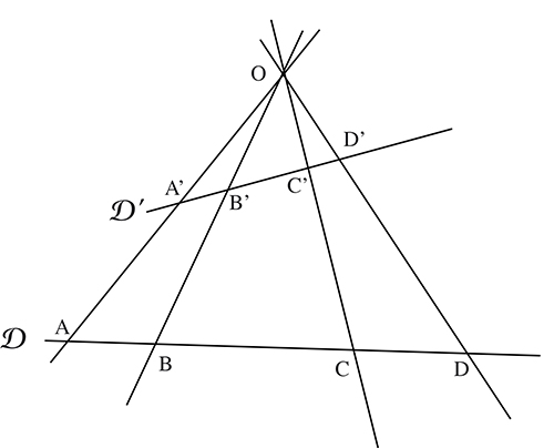 Un point O étant choisi, le birapport de quatre points A, B, C et D d’un même cercle est celui des quatre droites (OA), (OB), (OC), (OD).