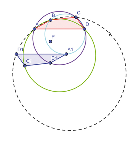 Les quadrilatères ABCD et A1B1C1D1 sont symétriques par rapport à un point P. On sait de plus que A1BCD, AB1CD et ABC1D sont inscriptibles (c’est-à-dire que leurs sommets sont cocycliques, ou appartiennent à un même cercle). Démontrer que ABCD1 l’est aussi.